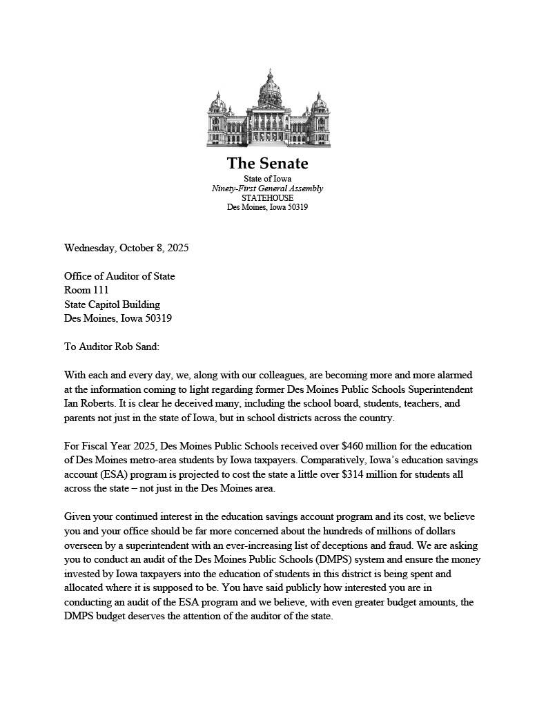 “I agree with these descriptions of Ian Roberts' deceptions and agree that DMPS needs to be more transparent around what happened here. But these legislators 1) should know that their request, snarky or not, doesn’t give us the ability to audit a school district; 2) all voted to legalize hiding documents from the State Auditor's Office, which could block an audit of these issues, and 3) supported the vouchers law they chose to bring into this, which provides for no audits whatsoever of private schools spending public money, despite the fact that every public school district, including DMPS, is audited every year. They all have my number. Had they just called me, I could have saved them the embarrassment of the public learning these lawmakers don’t know, or don’t care about, the law. I will still take their calls to save them further embarrassment.”