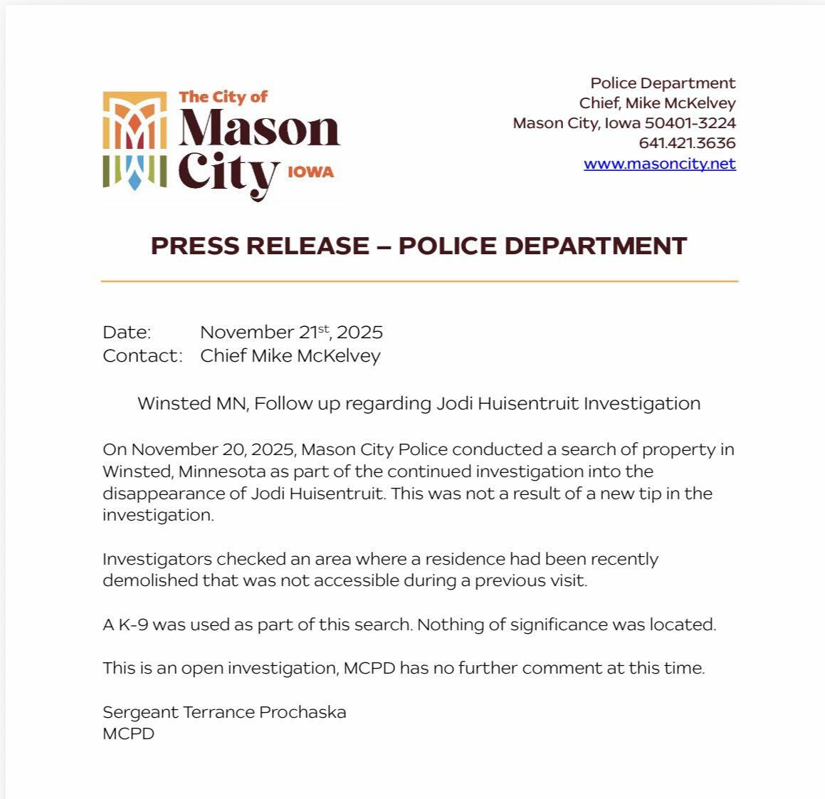 Acting Mason City Police Chief Mike McKelvey issued the following statement to Find Jodi, Inc.: